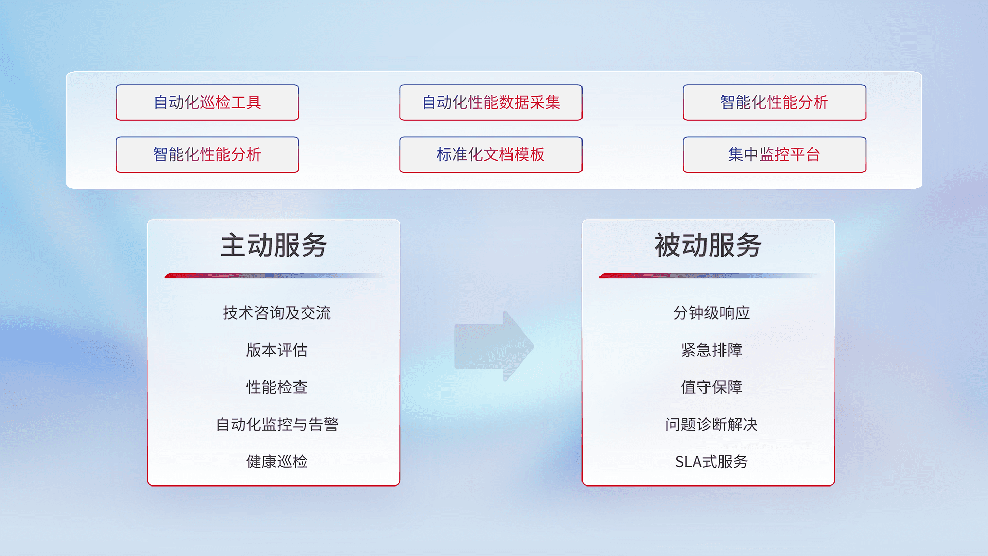 智能化工具和标准化文档,,保障服务质量,,,,提供主动服务(包含技术咨询、、、版本评估、、、性能检查、、、自动化监控与告警、、健康巡检)和被动服务包含(分钟级响应、、、、紧急排障、、、、值守保障、、、、问题诊断解决、、、SLA服务)。。。。